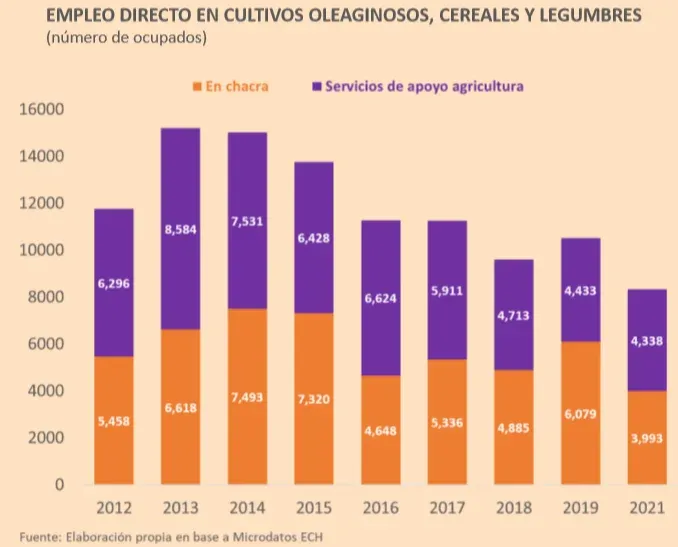 Según el CED, por trabajo en chacra y servicios agrícolas, la agricultura de secano ha empleado entre 8 mil y 15 mil personas en los últimos años, con una tendencia decreciente que "podría verse interrumpida en 2022" dada la buena conjunción de aumento de área implantada, buenos precios y clima favorable. En 2021 la agricultura de secano ocupo a unas 8.300 personas, su peor desempeño de los últimos nueve años.