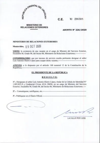 La Cancillería ya tiene resuelto que el dirigente colorado sustituya a Carlos Barros, actual embajador. El pasado 9 de octubre se dictó una resolución por la cual se designa a Hierro en un cargo de Ministro del Servicio Exterior, Escalafón M, Grado 06, del Ministerio de Relaciones Exteriores. Fuentes diplomáticas explicaron que es el "paso previo" para designarlo en la Embajada uruguaya en Perú.