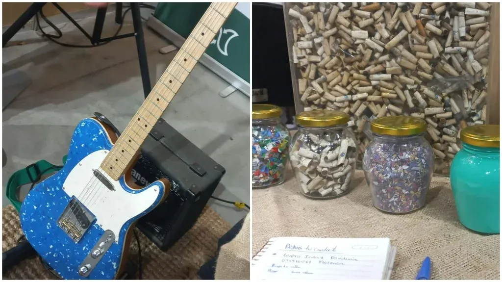Un componente que sale de las colillas, que parece un algodón, "en realidad es un plástico llamado acetato de celulosa que se disuelve, se logra un nuevo plástico, que se utiliza para hacer partes de guitarras elétricas". También realizan pinturas con las que decoran luego "murales en escuelas y en colegios de todo el país", añade Bentancor.