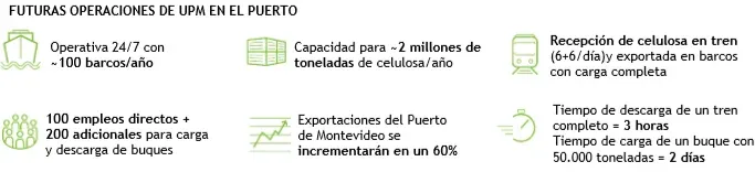 "El nivel de automatización, con más de 1.200 lazos de control incorporados en un avanzado sistema de control de procesos, es innovador en comparación con operaciones portuarias convencionales", destacó UPM en un comunicado. Esta nueva plataforma logística cuenta con un amplio depósito de almacenamiento de 51 mil metros cuadrados techados, con vías de ingreso para el ferrocarril, sala de control, espacios logísticos y oficinas.