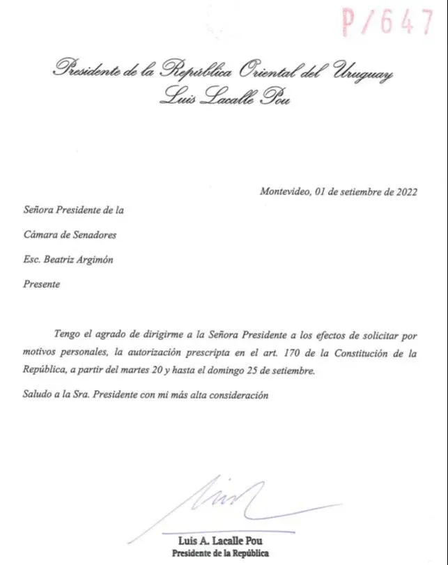 El presidente de la República, Luis Lacalle Pou, solicitó autorización al Parlamento para ausentarse de su cargo por "motivos personales" a partir del martes 20 de setiembre hasta el domingo 25.