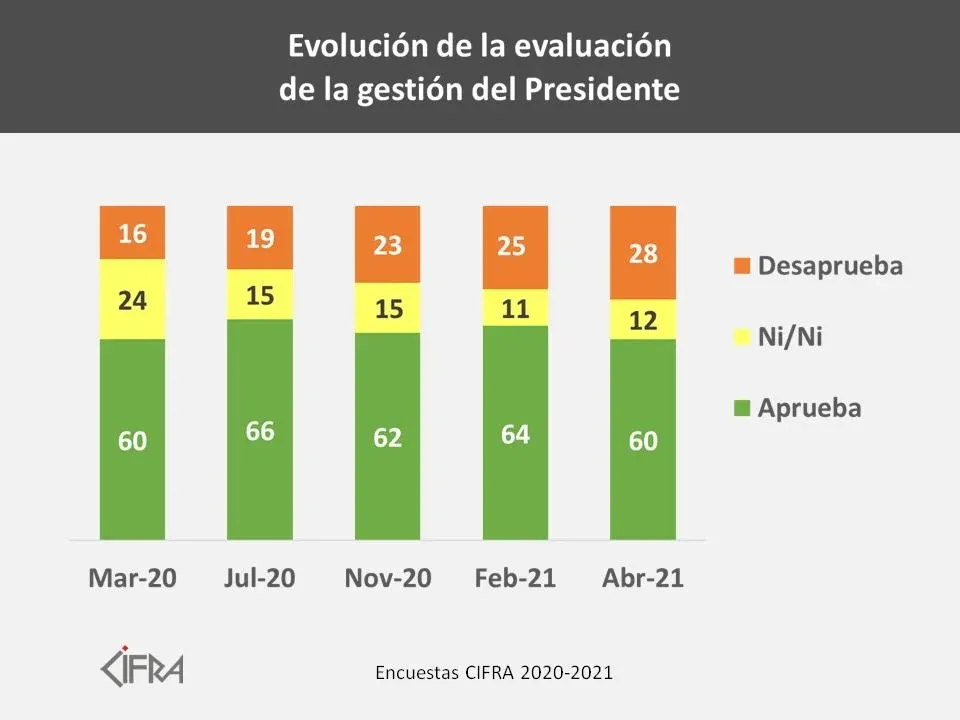 La muestra fue realizada con similares características de la realizada en febrero de este año, cuando arrojó un resultado favorable en un 64%; es decir, su aprobación cayó cuatro puntos porcentuales en dos meses.