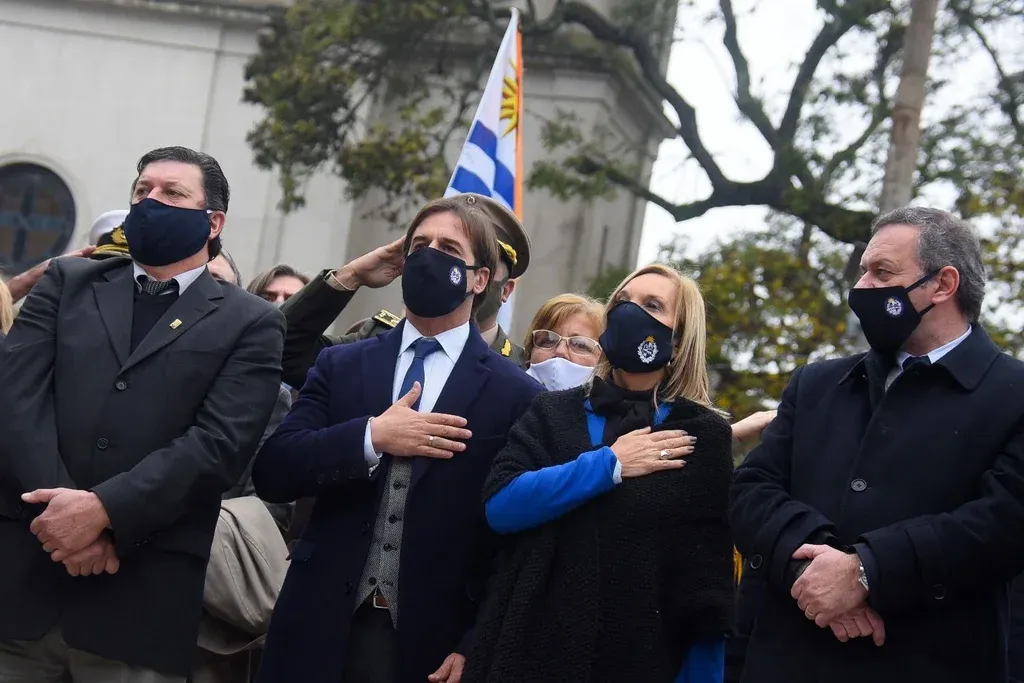 Lacalle Pou saludó a los ministros uno por uno con el puño. Se detuvo junto a Daniel Salinas, le hizo un breve comentario y le señaló con el dedo una de las ofrendas florales que minutos después depositarían a los pies del monumento a José Gervasio Artigas. Lo mismo hizo con Azucena Arbeleche, a quien saludó después.