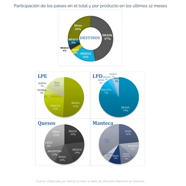 Brasil fue el principal destino para leche en polvo entera (51% del total embarcado), para la leche en polvo descremada (79%) y para los quesos (23%), mientras Rusia lo fue para la manteca (con el 24%).