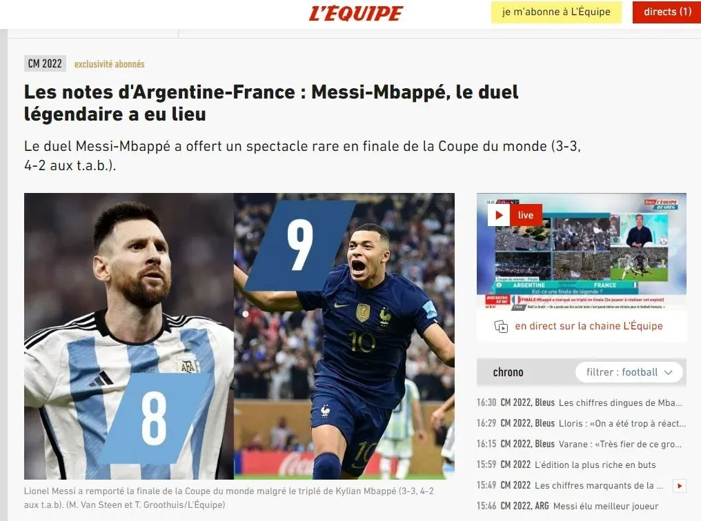 Los medios franceses hablaron de "final legendaria" tras el partido que dio el título mundial a la selección de Argentina