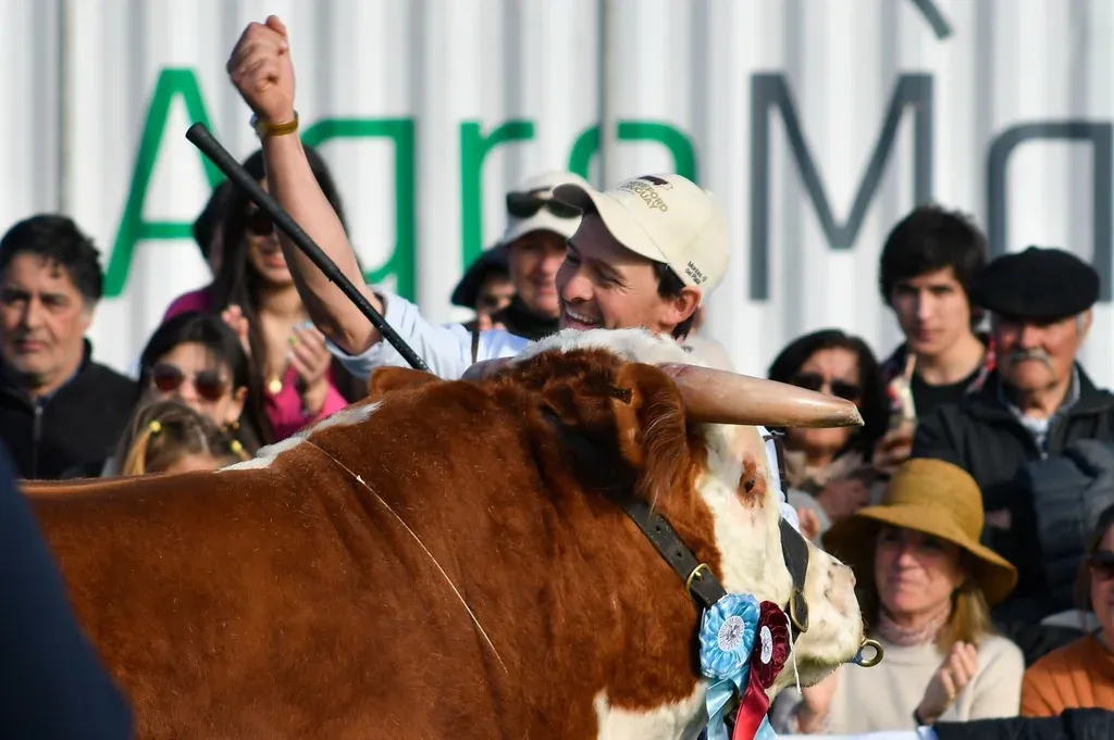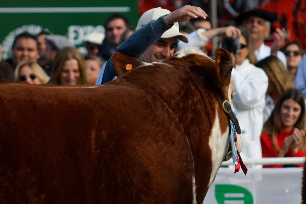 Foto: Leonardo Carreño. El festejo del cabañero de La Elisa por la obtención de la cocarda de Gran Campeón. El Gran Campeón, apuntó, “es hermano entero de la Gran Campeona y Campeona Suprema de 2021 acá en el Prado, nos gusta extremadamente por su construcción, es muy suave en su delantera, es un animal que se desplaza muy bien y muy potente de lomo, patas y cuartos, con excelentes testículos, con la pigmentación que debe tener el Hereford, colocación de ojos, un barril adecuado para producir a pasto, el arco costal ideal para una buena capacidad ruminal, es un toro bastante cercano a lo que buscamos”.