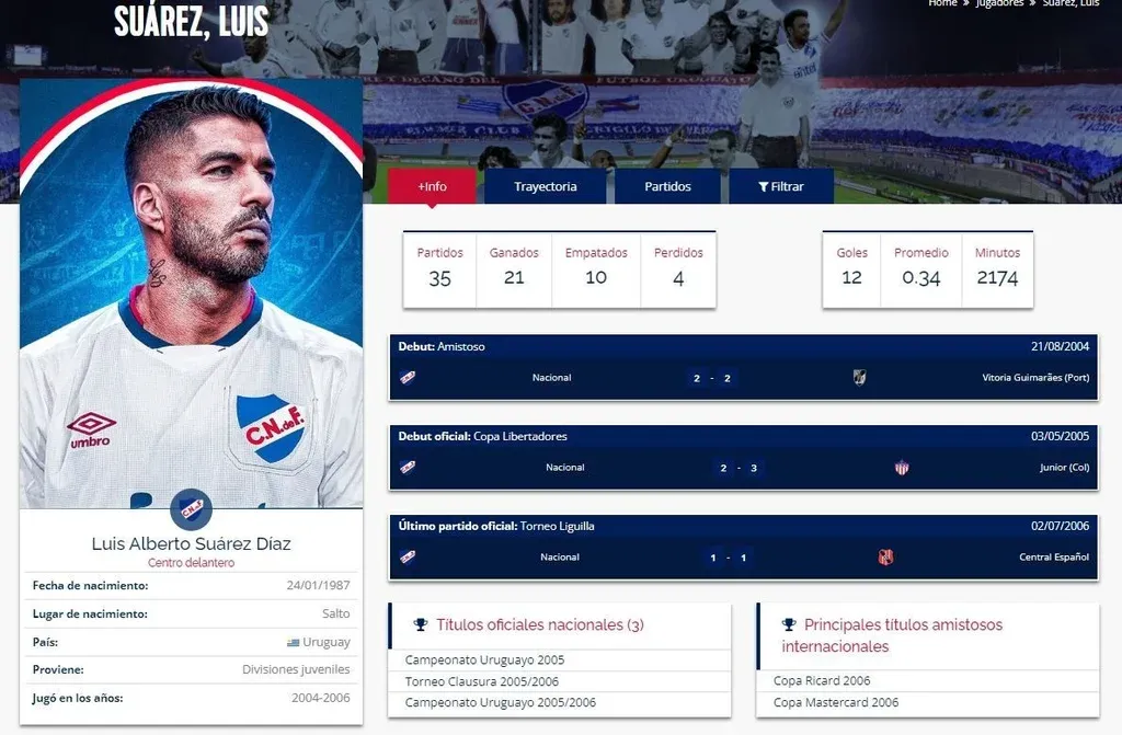 @Nacional Historia La ficha de Suárez en la web de Atilio En el fichero de Suárez colocaron la foto que se viralizó en las redes en medio de la campaña #SuarezANacional de los hinchas tricolores. La imagen también está en la cuenta de Twitter de la comisión.