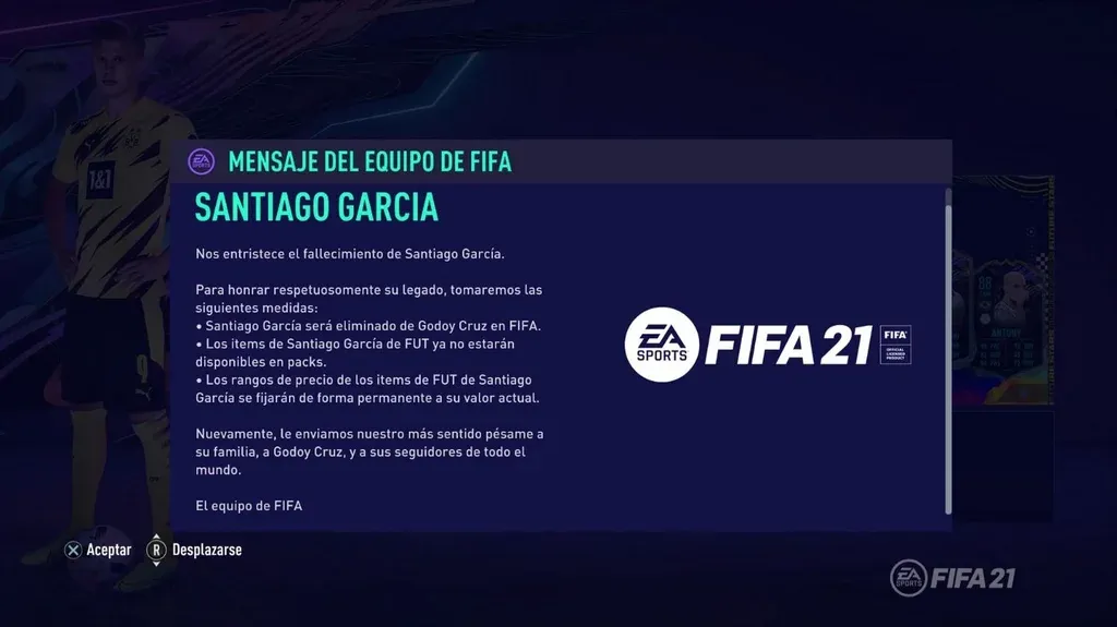 En el modo Ultimate Team, el más jugado en FIFA, "los items de Santiago García ya no estarán disponibles en packs". Esto significa que la figura de García no aparecerá en las famosas cartas que se pueden abrir día a día.
