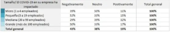 La primera pregunta de la encuesta buscó analizar el impacto del covid-19 en las empresas, a las que se les pidió que lo calificaran como positivo, negativo o neutro, según su caso particular. El 62% de las empresas afirman haber estado afectadas por el covid-19, aunque de ellas, el 30% menciona que el impacto fue positivo.