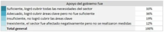 Consultadas sobre los apoyos dados por el gobierno (respondieron 7 de cada 10) para mitigar los efectos de la pandemia, el 33% de las empresas contestaron que fueron suficientes, logrando cubrir todas las necesidades del sector. Por otra parte, el 36% de las empresas manifestaron que el apoyo logró cubrir áreas clave, pero no fue suficiente, y el 19% de las empresas manifestaron que no fue suficiente el apoyo, no llegando a cubrir áreas clave.