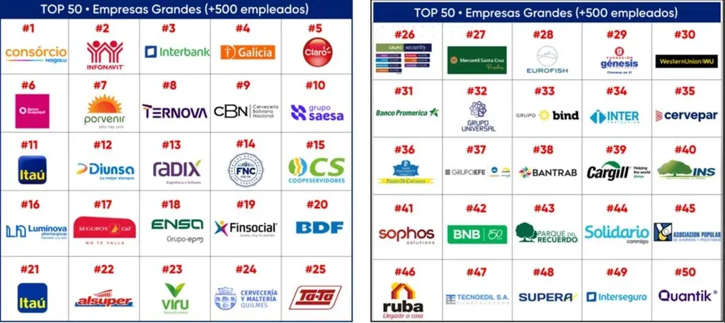La brasileña Magazine Luiza, del rubro retail, fue la más destacada en la categoría de empresas de más de 500 empleados, según la valoración de sus trabajadores que recogió GPTW. Los cinco primeros lugares de esta lista fueron completados por Infonavit, una mexicana que brinda servicios financieros; la peruana de servicios financieros y de seguros Interbank; el banco argentino Galicia, y Claro Dominicana, la filial del conglomerado de telecomunicaciones en República Dominicana.