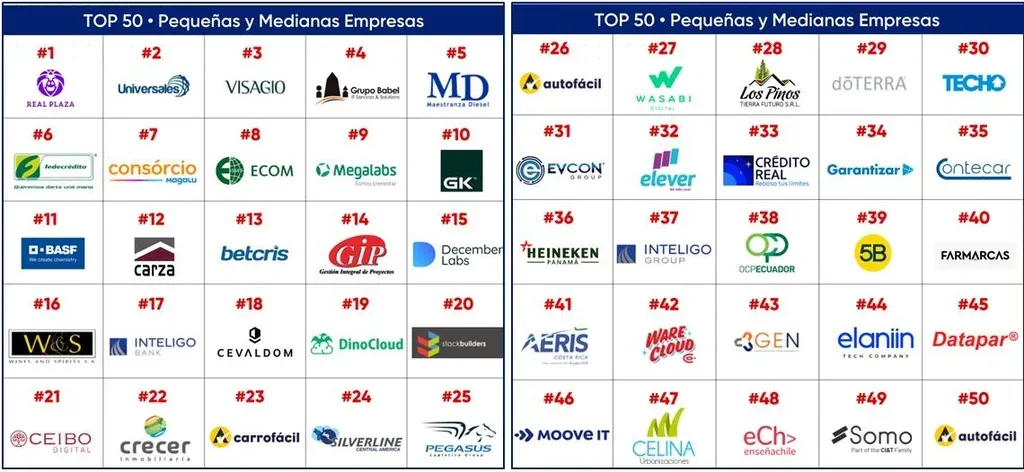 La compañía latinoamericana mejor posicionada en la categoría de pequeñas y medianas empresas fue Real Plaza, del rubro de la construcción, infraestructura e inmuebles, que opera en 13 ciudades de Perú. El segundo puesto lo ocupó Seguros Universal, una guatemalteca que brinda servicios financieros. El top cinco se completó con la consultora Visagio Consultoria Assessoria e desenvolvimento Ltda (Brasil); la tecnológica Grupo Babel (Costa Rica) y la fabricadora de maquinaria Maestranza Diesel (Chile).
