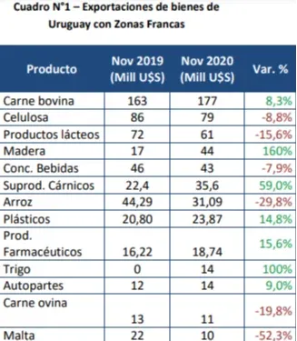 Las exportaciones de bienes de –incluyendo zonas francas– cayeron 3,4% (a US$ 672 millones) en noviembre y moderaron su contracción respecto a meses anteriores desde que estalló la pandemia (fines de marzo), según datos de Uruguay XXI.