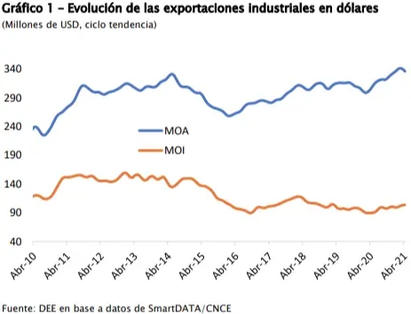 Al realizarse un análisis comparativo con abril del 2019, puede concluirse que las exportaciones industriales registraron un aumento sensiblemente menor (6,2%). Si se considera el acumulado del año, las exportaciones de bienes industriales aumentaron 27,7% en comparación con enero–abril de 2020 y solo 7,1% en comparación con enero–abril 2019, dice el informe de comercio exterior de bienes que divulgó la Cámara de Industrias (CIU).