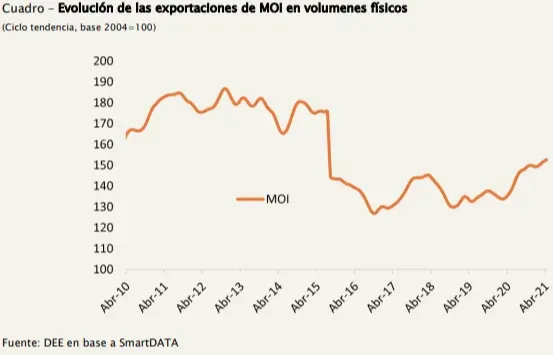 Desagregando por tipo de manufactura, las exportaciones de Manufacturas de Origen Industrial (MOI) aumentaron 91% en la comparación interanual, situándose en US$ 105 millones. Sin embargo, registraron un aumento significativamente menor si se compara con abril de 2019 (5,6%). Considerando los primeros cuatro meses del año, las MOI verificaron un crecimiento del 25,7% en comparación con los primeros cuatro meses de 2020, pero disminuyeron 2,2% en comparación con enero – abril del 2019.