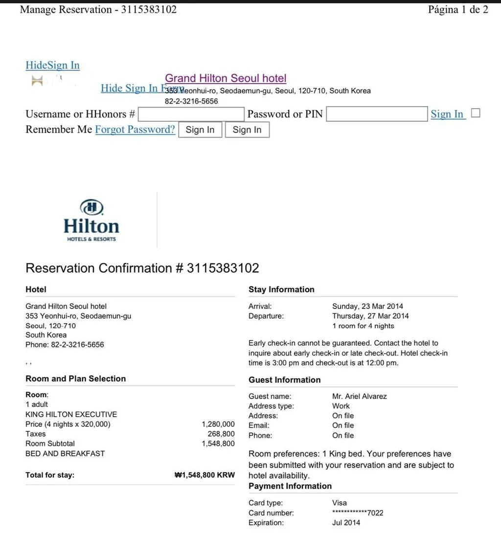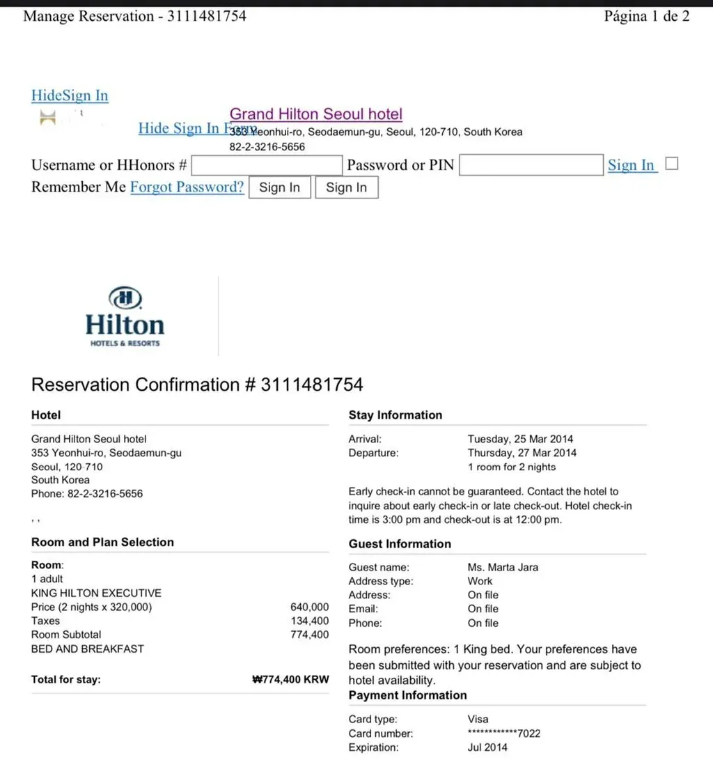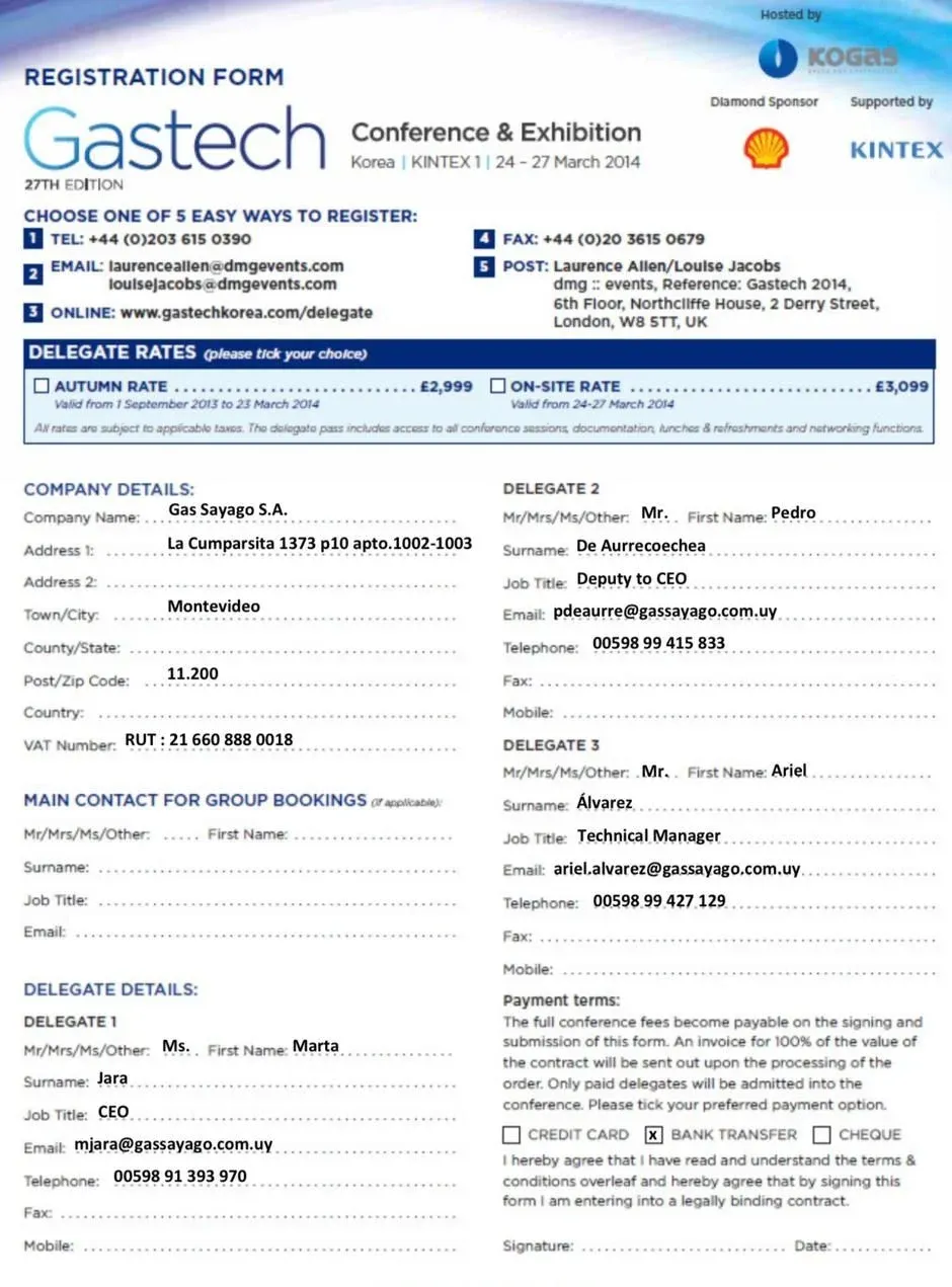 Dentro de las pruebas se presentó un estado de cuenta de la tarjeta corporativa de Gas Sayago de setiembre de 2014 que detalla un gasto en pesos por $ 18.712 y otro en dólares por US$ 4.946. También se sumaron facturas de alojamiento del gerente técnico, Ariel Álvarez, y Marta Jara en el hotel Hilton en Seúl (Corea) de marzo de ese mismo año. Durand dijo a El Observador que ese evento tuvo como “patrocinador” a la multinacional Shell, la empresa donde previamente había trabajado Jara y que luego mostró cierto interés por hacerse cargo del proyecto de la regasificador tras el retiro de GNLS.