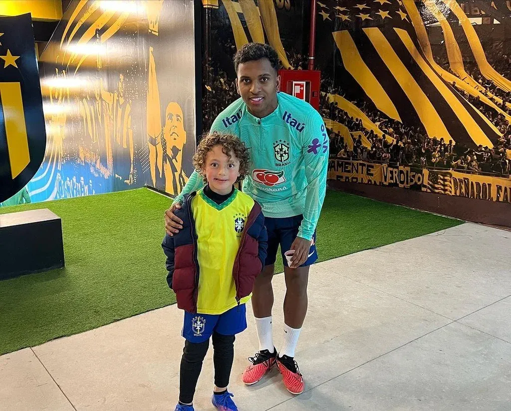 Rodrygo, el delantero de Real Madrid, en el Estadio Campeón del Siglo de Peñarol junto al hijo de Léo Coelho