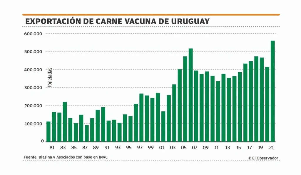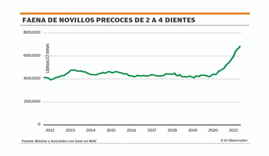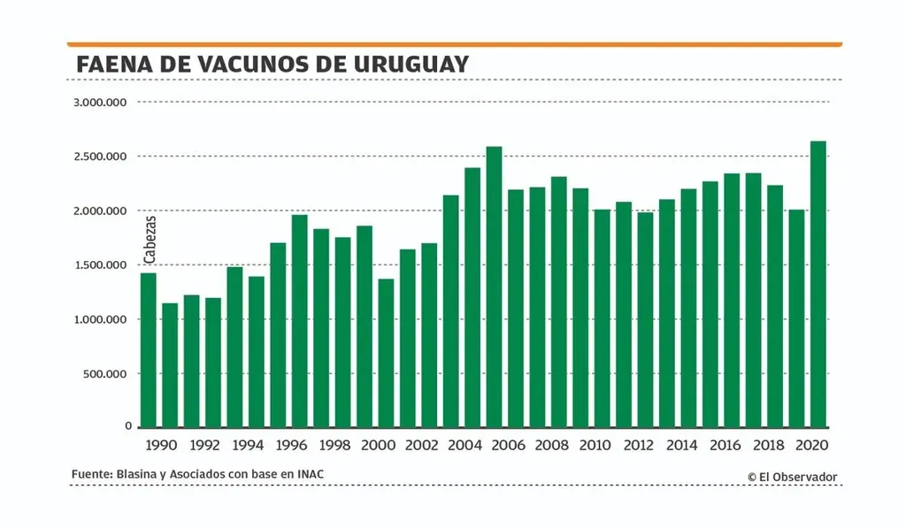 En un muy buen año como fue 2019 la actividad fue de 2,23 millones en tanto en 2020 quedó prácticamente en dos millones. Puede adjudicarse parte de lo no faenado en 2020, año de pico de pandemia, al fuerte número de este año.