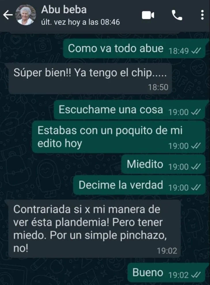 Capaz que tenía razón, pero la ignoré. Me escribió su hija, mi madre, ya vacunada. "Capaz que no es para ella, ¿y si le hace mal? Son señales, por algo la demoran. Que no se vacune".