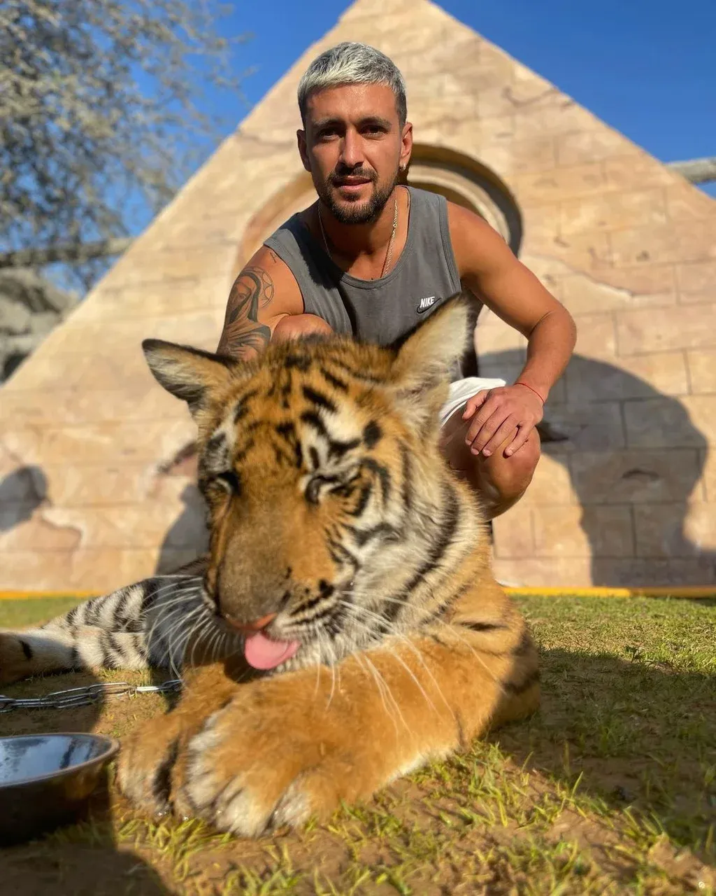 Giorgian De Arrascaeta junto a un tigre de bengala Allí convivió con un enorme león blanco primero que lo asombró por su tamaño.