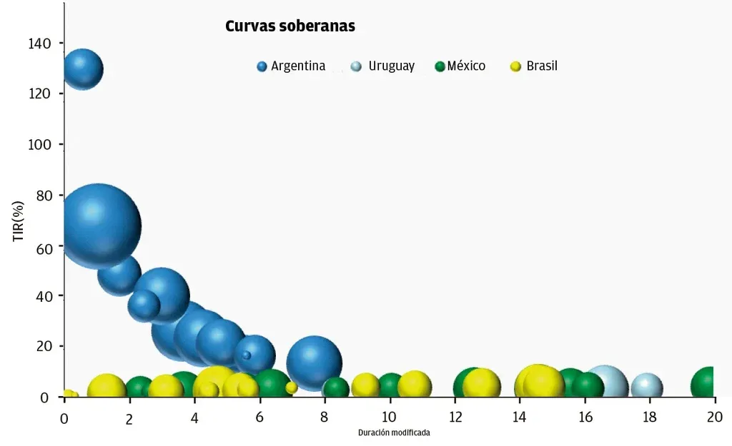 La curva argentina no solamente presenta valores extremos (el bono en dólares que vence en un año tiene un rendimiento esperado superior a 100% mientras que los bonos uruguayos a similar plazo tienen una rentabilidad esperada levemente superior a 2%) sino que tiene una forma diferente.