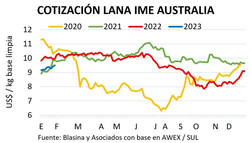 El Indicador de Mercados del Este (IME) cerró la semana a US$ 9,50 por kilo base limpia, su mayor valor en siete meses. El aumento semanal fue de 2,6% en dólares, aunque retrocedió levemente en moneda local ya que el dólar australiano se fortaleció 2,8%. En su quinta semana al alza el indicador recuperó 15% de su valor en moneda estadounidense.