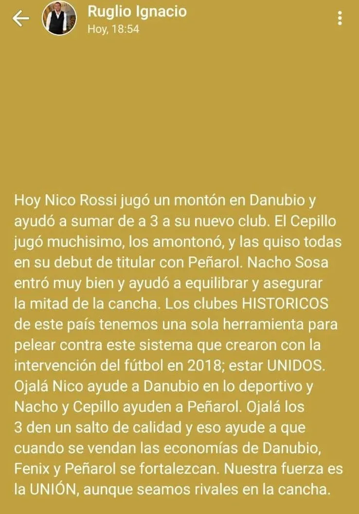 "Hoy Nico Rossi jugó un montón en Danubio y ayudó a sumar de a tres a su nuevo club. El Cepillo jugó muchísimo, los amontonó, y las quiso todas en su debut de titular con Peñarol. Nacho Sosa entró muy bien y ayudó a equilibrar y a asegurar la mitad de la cancha. Los clubes HISTÓRICOS de este país tenemos una sola herramienta para pelear contra este sistema que crearon con la intervención del fútbol en 2018; estar UNIDOS", escribió.