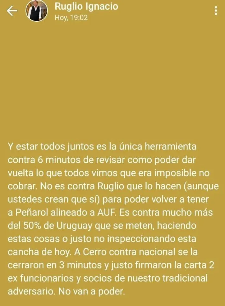 En otro posteo escribió: "Y estar todos juntos es la única herramienta contra 6 minutos de revisar cómo poder dar vuelta lo que todos vimos que era imposible no cobrar. No es contra Ruglio que lo hacen (aunque ustedes crean que sí) para poder volver a tener a Peñarol alineado a AUF. Es contra mucho más del 50% de Uruguay que se meten, haciendo estas cosas o justo no inspeccionando esta cancha de hoy (el Parque Artigas de Las Piedras). A Cerro contra Nacional se la cerraron en 3 minutos y junto firmaron la carta dos exfuncionarios y socios de nuestro tradicional adversario. No van a poder".