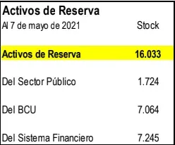 El pasado viernes 7 de mayo, el Banco Central del Uruguay (BCU) mostraba activos de reserva por US$ 16.033 millones, pero solo el 44% de esa cifra (US$ 7.064 millones) eran “reservas propias” de la autoridad monetaria, sin contrapartidas de los sectores público y financiero.