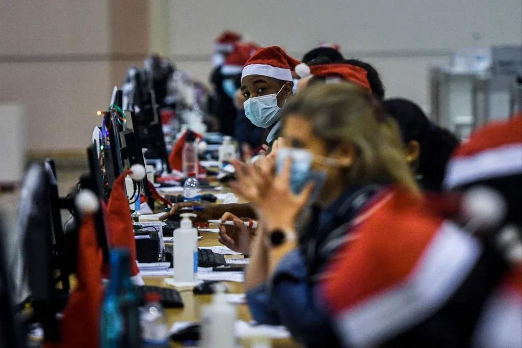 Trabajadores de la salud con sombreros de Papá Noel trabajan en un centro de vacunación en Lisboa.