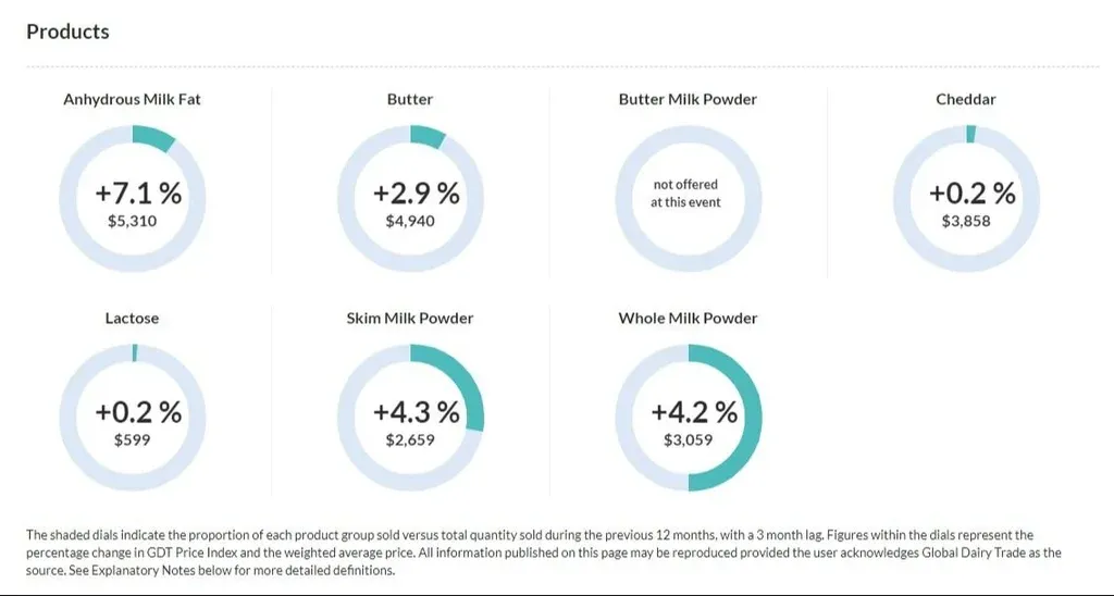 Las referencias de precios promedio para los lácteos en el mercado internacional se volvieron a afirmar, con un relevante movimiento al alza este martes 17, en la segunda licitación de octubre en la plataforma Global Dairy Trade - Fonterra.