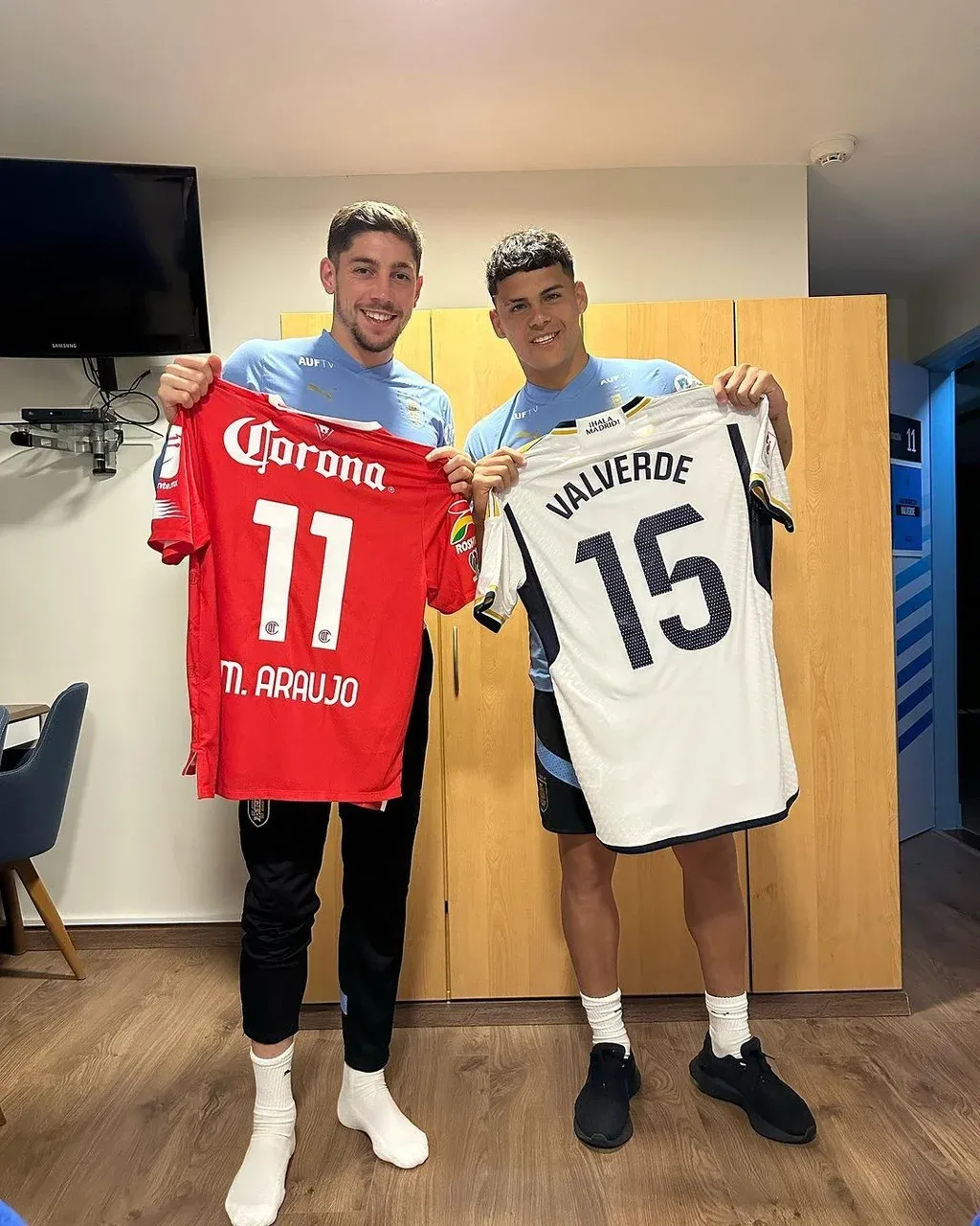 Araújo también subió una foto de un intercambio de camiseta con Fede Valverde y otra en la que aparece saltando en la barrera junto a Nico De la Cruz, Darwin Núñez y Ronald Araújo en un partido de la selección.