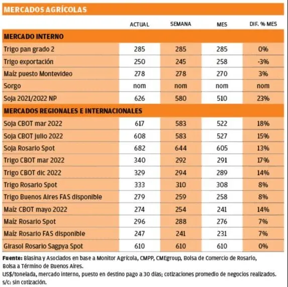De todos modos, la oleaginosa sostiene cotizaciones extraordinarias, por encima de los US$ 600 por tonelada, mientras que en el caso del trigo el alto precio internacional no se traslada a las cotizaciones uruguayas, que se mantienen sobre los US$ 260 por toneladas, US$ 80 debajo de lo que referencia Chicago, mientras que en el caso de la soja se paga lo mismo que pauta la referencia internacional.