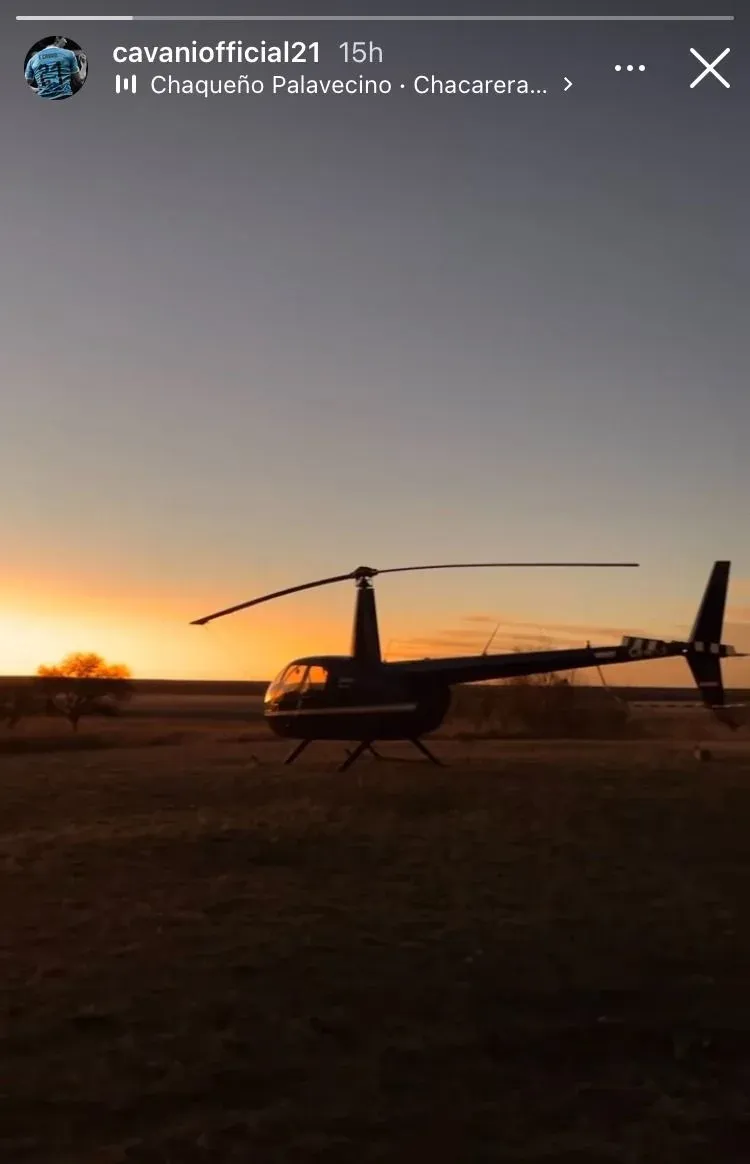 El delantero se instaló en La Pampa, Argentina, y publicó en sus historias de Instagram la foto del helicóptero, el atardecer y de fondo, una canción del Chaqueño Palavecino.