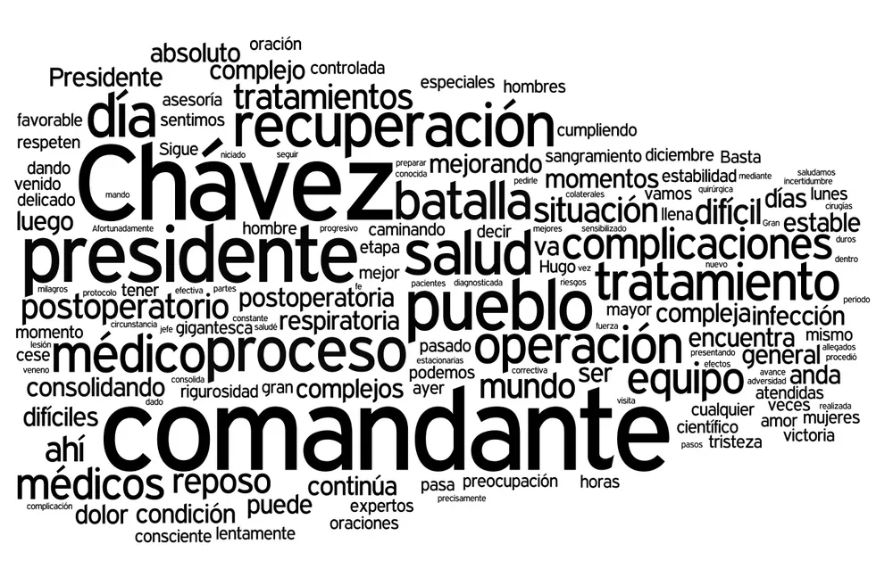 "La operación del día de ayer fue una operación, compleja, difícil, delicada, lo cual nos dice que el proceso postoperatorio va a ser también complejo y duro"; "Fue muy claro en la necesidad de que nuestro pueblo lo acompañe en el proceso de tratamiento, pero que también esté serenamente preparado para enfrentar estos días duros, complejos, difíciles que sólo puede ser enfrentados por la unidad del pueblo"; "Más temprano que tarde, vamos a tener a nuestro comandante aquí"; "En las últimas horas, "dicho proceso de recuperación ha evolucionado de estable a favorable"; "Se presentó una complicación por causa de un sangramiento no previsto"; "Fue controlado oportunamente, pero creó una situación difícil en su momento"; "Gran complejidad"; Recuperación postoperatoria delicado y prolongado"; "Horas de dolor, de tristeza, de incertidumbre"; "Nuestras caras son expresión del dolor, la preocupación y el amor más puro que sentimos por Hugo Chávez, nuestro comandante"; "Bajo absoluta responsabilidad y conciencia preparar al pueblo ante cualquier circunstancia"; "Los hombres y mujeres estamos dando la batalla espiritual para sanar al presidente"