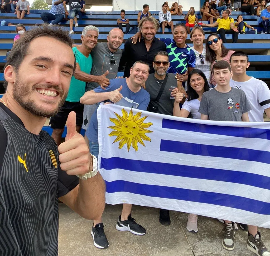 Emiliano Lasa celebra la histórica marca junto a un grupo de uruguayos entre los que se encuentran Diego Lugano y Déborah Rodríguez