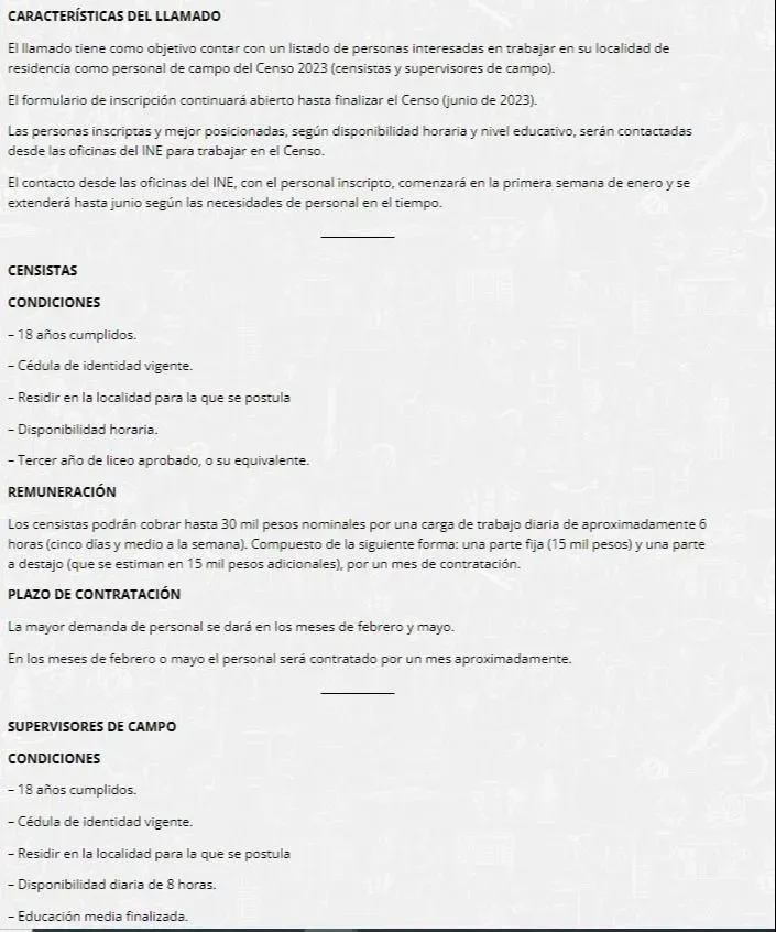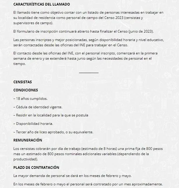 El 14 de febrero El Observador publicó las bases del llamado que constatan lo dicho por Ludzcanoff. Quienes trabajen de censistas podrán cobrar hasta $30 mil nominales por una carga de trabajo diaria de aproximadamente 6 horas (cinco días y medio a la semana). La potencial suma se divide en dos: una parte fija de $15 mil y otra parte de acuerdo al trabajo que realice la persona, que se estima también de $15 mil "por un mes de contratación", se explicaba en el llamado, que aparece todavía publicado en la página web.