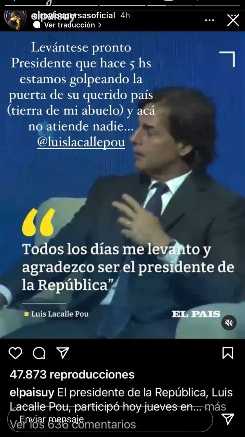 Sobre las cinco de la mañana, el músico publicó una cita de una entrevista de Lacalle Pou en la que el mandatario decía "todos los días me levanto y agradezco ser el presidente de la República", junto a su respuesta. "Levántese pronto presidente que hace cinco horas estamos golpeando la puerta de su querido país (tierra de mi abuelo) y acá no atiende nadie @luislacallepou", agregando su conexión familiar con el país, que menciona en cada una de sus visitas junto a su cariño por Cerrito, el equipo de su abuelo.