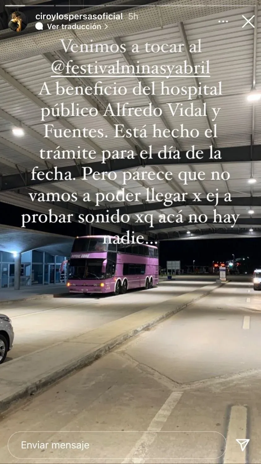 "Está hecho el trámite para el día de la fecha. Pero parece que no vamos a poder llegar por ejemplo a probar sonido porque acá no hay nadie", siguió el músico.