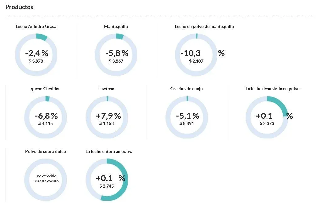 Por su parte, la manteca registró un valor de US$ 3.867 presentando una baja de 5,8%. Los quesos Cheddar se pagaron a US$ 4.115 con una merma de 6,8%, mientras que la leche en polvo descremada se ubicó en US$ 2.373, presentando un leve aumento de de 0,1%.