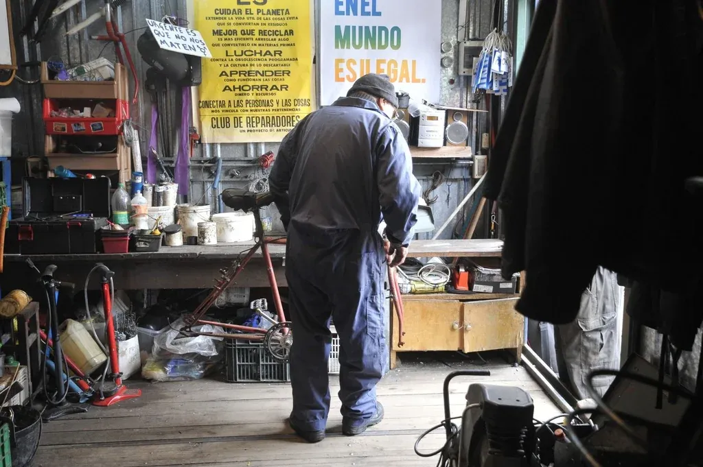 Carlos se saca el casco, apoya su bicicleta en el piso, abre el portón primero, la puerta del contenedor después, y se mete en el taller. Se pone un mameluco negro y ya está listo para empezar. Ahí llega Eduardo. En bicicleta también. La conduce con la mano derecha y con la izquierda lleva agarrada otra, que reparó en su casa y que ya está lista para ser entregada a un nuevo dueño o dueña.