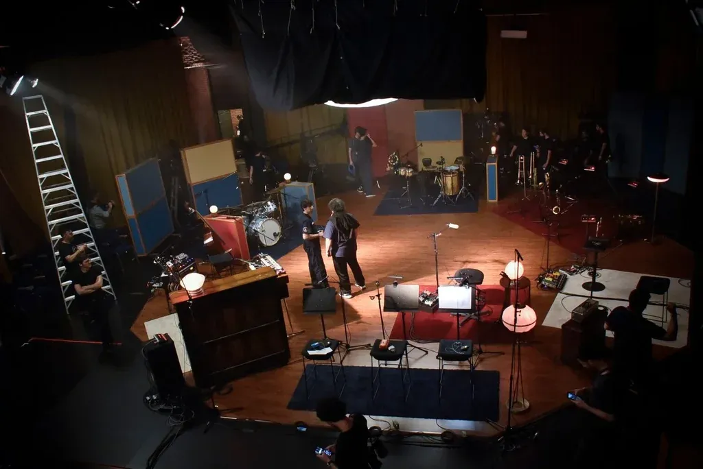 La pieza central de la construcción de la banda para la grabación es “el decágono”, una plataforma de madera de diez lados sobre la que se ubican los músicos en círculo, con una decoración de lámparas y paneles de colores, que le dan un estilo vintage a la sala y que, junto a las camisas y pantalones que llevan los integrantes de NTVG, le dan un toque de elegancia al asunto.