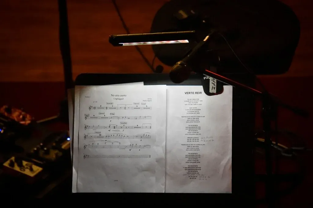 Camilo dos Santos Entre toma y toma, así como entre canción y canción, la sala reconvertida en estudio se llenaba de miembros del equipo de rodaje, a cargo de la productora Pardelion, y bajo la dirección de Rodrigo Labella. Vestidos de riguroso negro, el enjambre de camarógrafos, maquilladores, escenógrafos, sonidistas y técnicos copaban el espacio, repartiéndose entre los músicos, que no paraban de hacer chistes y comentarios. Entre todos ellos estaba el venezolano Héctor Castillo, productor de Suenan las alarmas y que aquí volvió a trabajar con NTVG para esta reformulación de canciones.
