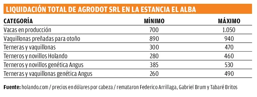 La liquidación total por la disolución de la sociedad Agrodot SRL, realizada en la estancia El Alba, en Campana –Colonia–, fue un éxito. Se vendió el 100% y con valores más que interesantes. El viernes 26 se dispersó un variado parque de maquinaria caracterizado por su muy buen mantenimiento y el sábado 27 los 1.600 animales, con mayoría de genética lechera de alto valor productivo por sus logros en sólidos. Y al frente de estos negocios estuvo Escritorio Urchitano Negocios Rurales.