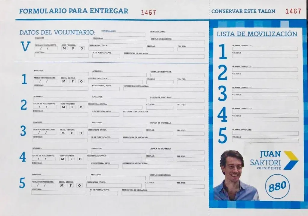 Entre los datos que deben llenarse en esos formularios está el nombre, fecha de nacimiento, sexo, dirección, cédula de identidad, teléfono celular y fijo, y datos de la credencial cívica. Con esta información, el equipo de Sartori podrá conocer los centros de votación de las personas dispuestas a votar al empresario, con el objetivo de llevarlos a votar el 30 de junio.