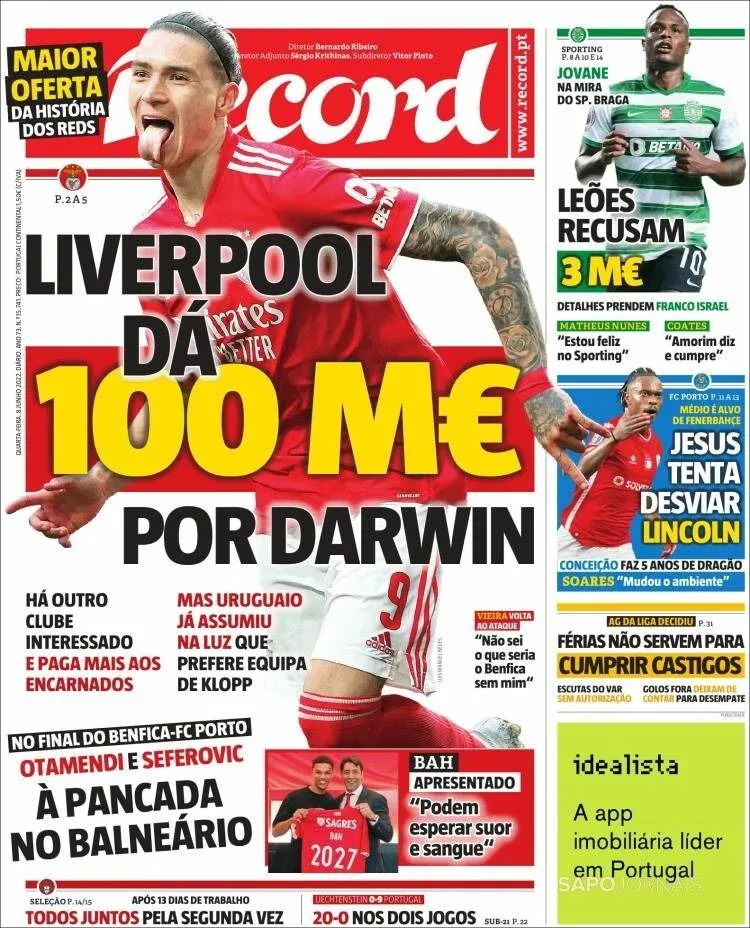 Así lo informa este miércoles el diario Record, de Lisboa, en la portada: el club que dirige Jürgen Klopp está dispuesto a desembolsar € 100 millones por el delantero de Benfica.