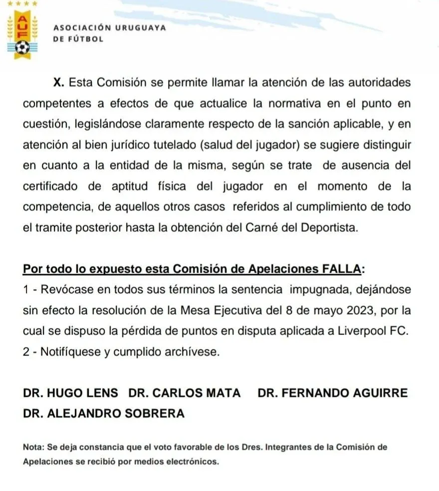 Tras la apelación de Liverpool el tribunal que integran Hugo Lens, Carlos Mata, Fernando Aguirre, Alejandro Sobrera revocó la sentencia y dejó "sin efecto la resolución de la Mesa Ejecutiva del 8 de mayo 2023, por la cual se dispuso la pérdida de puntos en disputa aplicada a Liverpool FC".