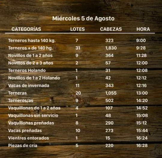 La firma destaca 500 terneros: 90 terneros que pesan 140 kilos base Red Angus; 300 terneros sola marca que pesan 150 kilos base Hereford; y 10 terneros que pesan 250 kilos base Angus.