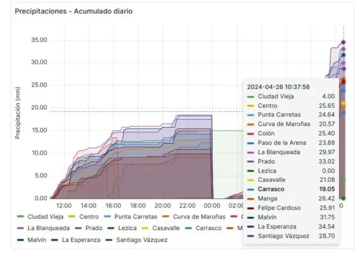Intendencia de Montevideo Las zonas con más lluvias en las últimas horas Por ejemplo, destaca zonas en Ciudad Vieja, Carrasco (rambia entre Potosí y Divina Comedia), Malvin (calle Asturias entre Rivera y Rambla, Pocitos (Lorenzo Pérez entre Echevarriarza y Manuel Haedo), Rambla a la altura de Parque Rodó y toda la zona de la calle La Paz a la altura de la estación de AFE, en la que en otras tormentas han terminado autos flotando.