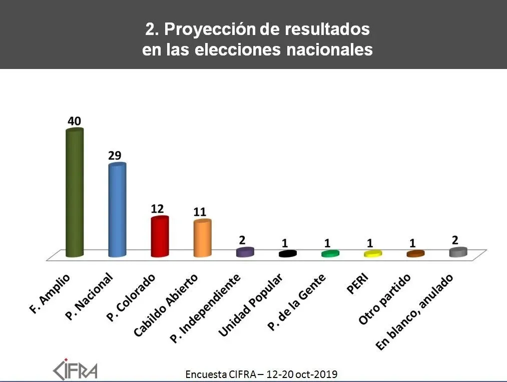 El lunes fue el tiempo para la presentación de la encuesta de Cifra. Según esa medición, el 38% de los encuestados piensa votar al Frente Amplio, el 27% al Partido Nacional, el 11% al Partido Colorado y el 10% a Cabildo Abierto.